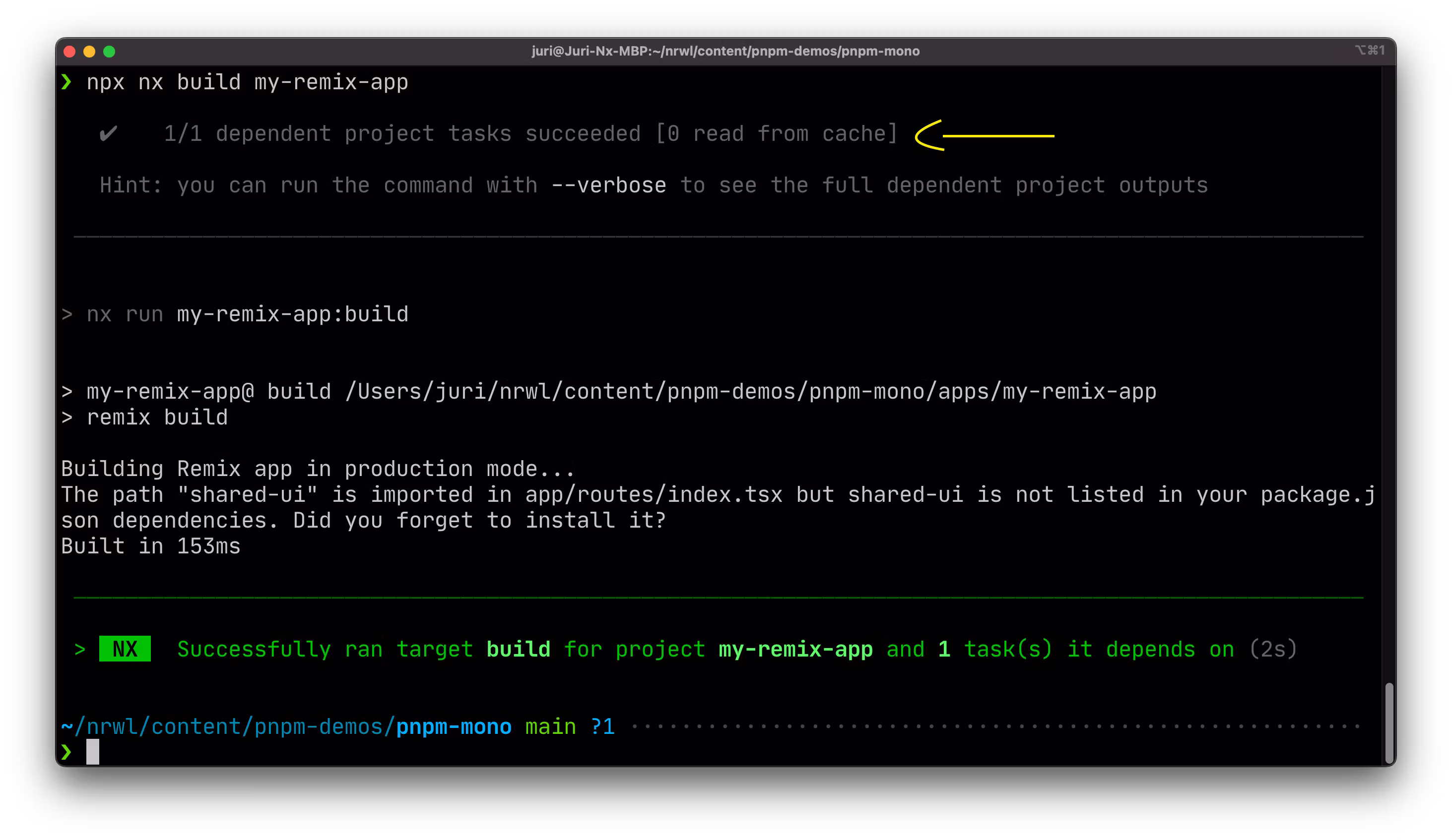 23If we now run npx nx build my-remix-app we can see that Nx first runs tasks on dependent projects, and only then runs the command we invoked.